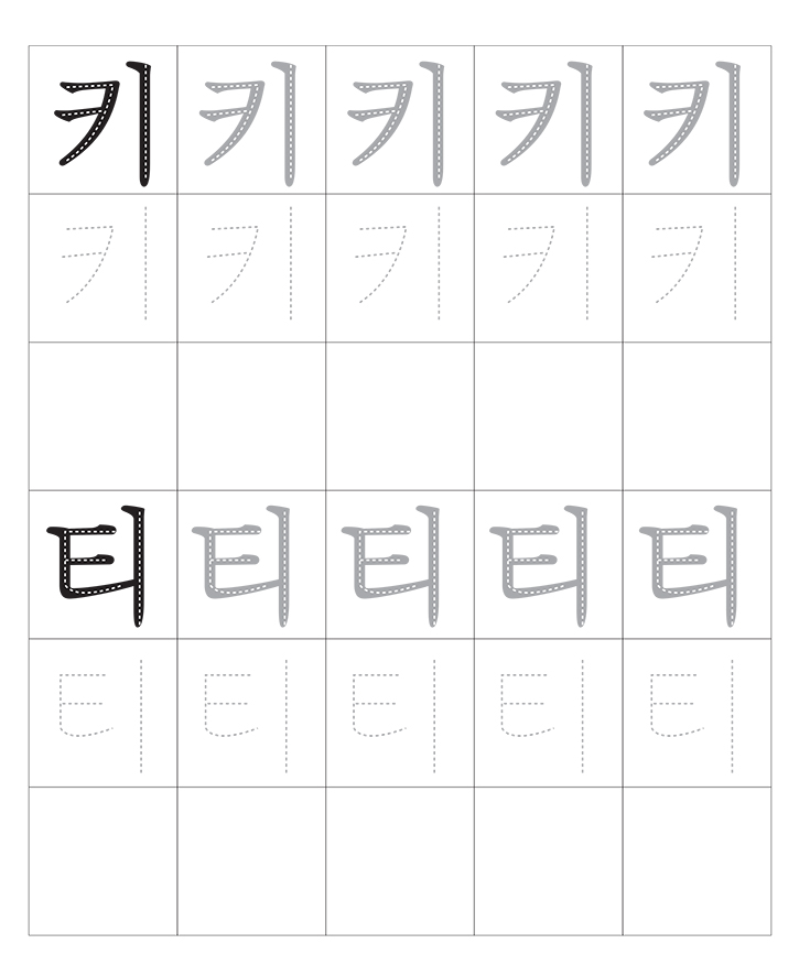 한국어 자음 모음의 조합(키~티)입니다. 소리내어 읽고 따라 씁니다. 반복 학습을 통해 한글을 이해합니다. 교사와 부모는 자녀가 잘할 수 있도록 격려하고 도와주세요.