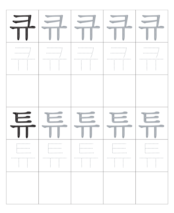 한국어 자음 모음의 조합(큐~튜)입니다. 소리내어 읽고 따라 씁니다. 반복 학습을 통해 한글을 이해합니다. 교사와 부모는 자녀가 잘할 수 있도록 격려하고 도와주세요.