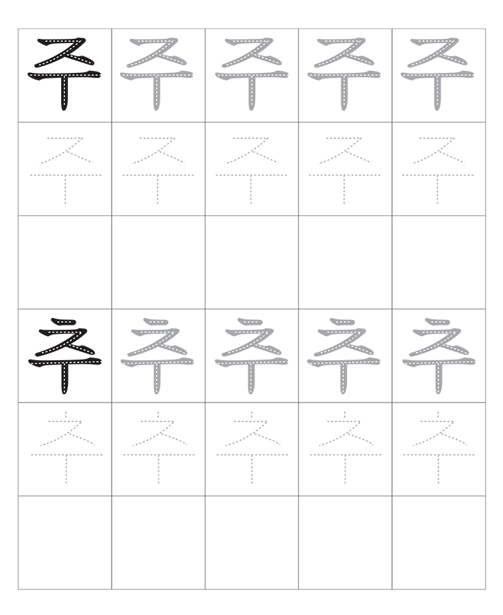 한국어 자음 모음의 조합(주~추)입니다. 소리내어 읽고 따라 씁니다. 반복 학습을 통해 한글을 이해합니다. 교사와 부모는 자녀가 잘할 수 있도록 격려하고 도와주세요.
