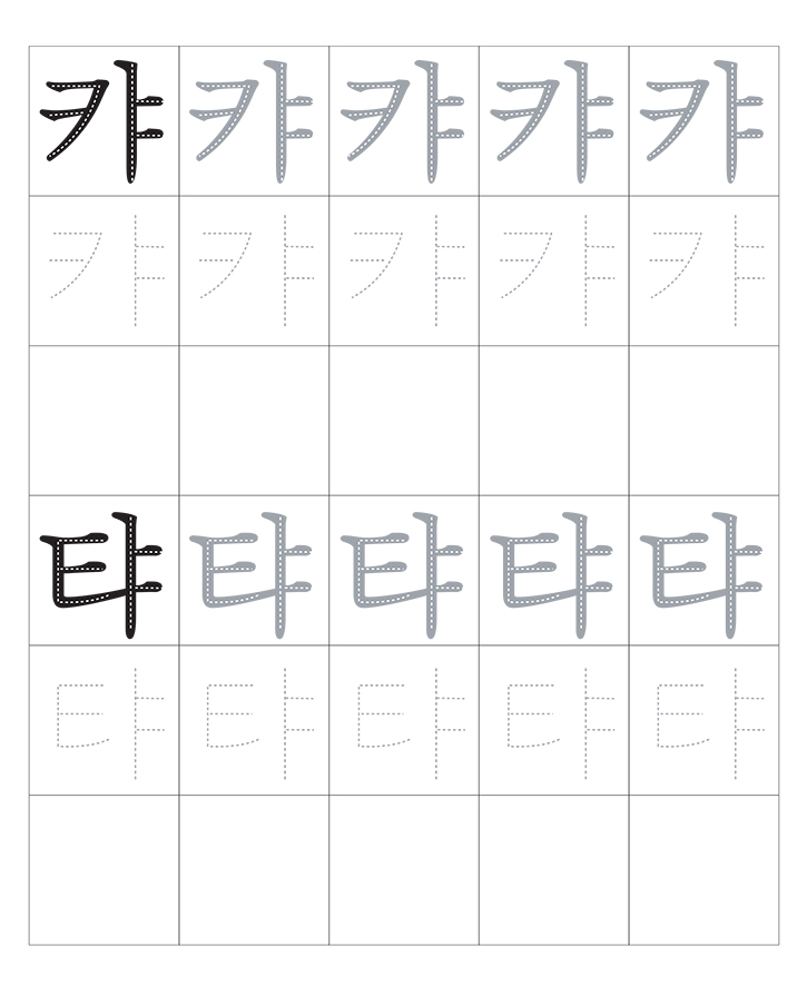 한국어 자음 모음의 조합(캬~탸)입니다. 소리내어 읽고 따라 씁니다. 반복 학습을 통해 한글을 이해합니다. 교사와 부모는 자녀가 잘할 수 있도록 격려하고 도와주세요.