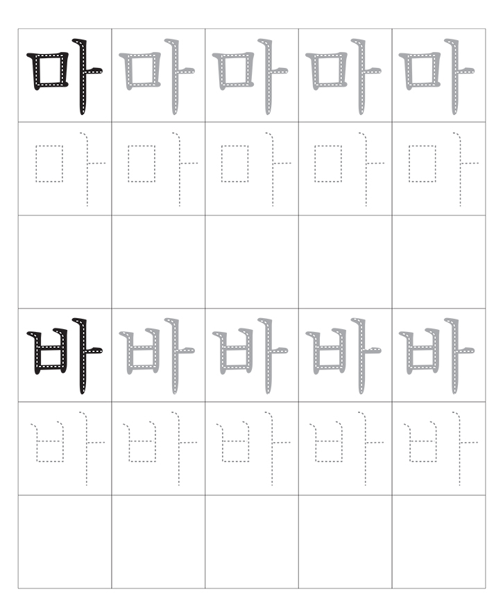 한국어 자음 모음의 조합(마~바)입니다. 소리내어 읽고 따라 씁니다. 반복 학습을 통해 한글을 이해합니다. 교사와 부모는 자녀가 잘할 수 있도록 격려하고 도와주세요.