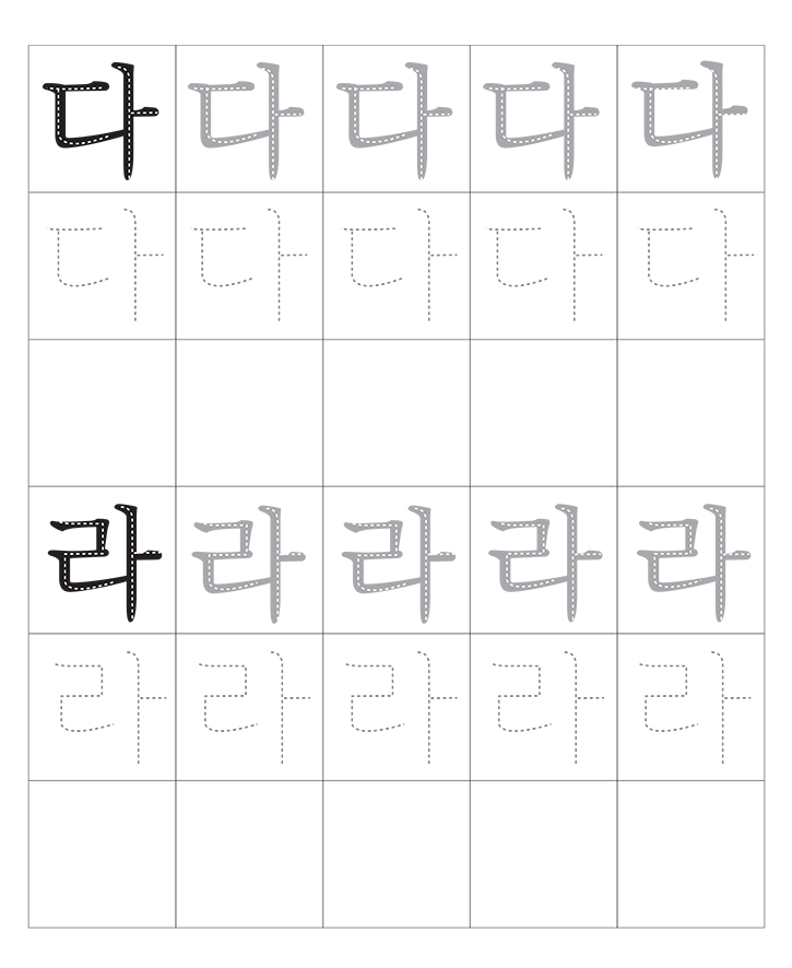 한국어 자음 모음의 조합(다~라)입니다. 소리내어 읽고 따라 씁니다. 반복 학습을 통해 한글을 이해합니다. 교사와 부모는 자녀가 잘할 수 있도록 격려하고 도와주세요.