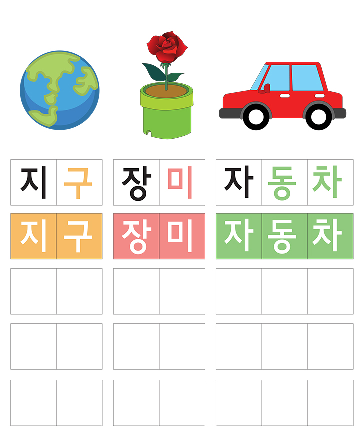 한글 단어(ㅈ)이 들어가는 낱말쓰기 입니다. 한글낱말 (지구,장미,자동차)를 빈칸에 큰소리로 읽고 따라쓰세요. 유아기에 필요한 기초 한글 통글자(읽기,쓰기,사물인지)와 관련하여 배울 수 있습니다.