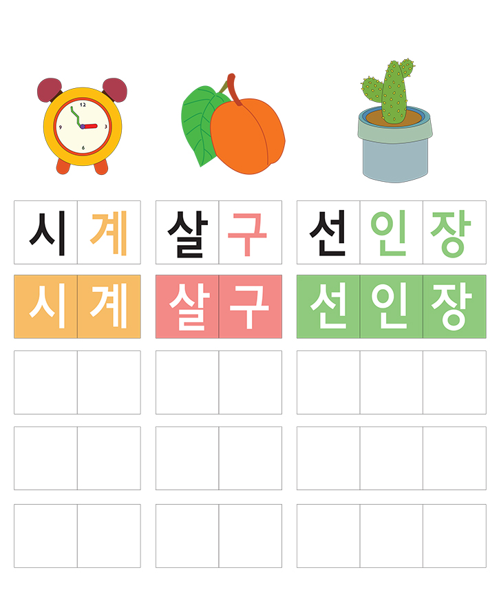 한글 단어(ㅅ)이 들어가는 낱말쓰기 입니다. 한글낱말 (시계,살구,선인장)를 빈칸에 큰소리로 읽고 따라쓰세요. 유아기에 필요한 기초 한글 통글자(읽기,쓰기,사물인지)와 관련하여 배울 수 있습니다.