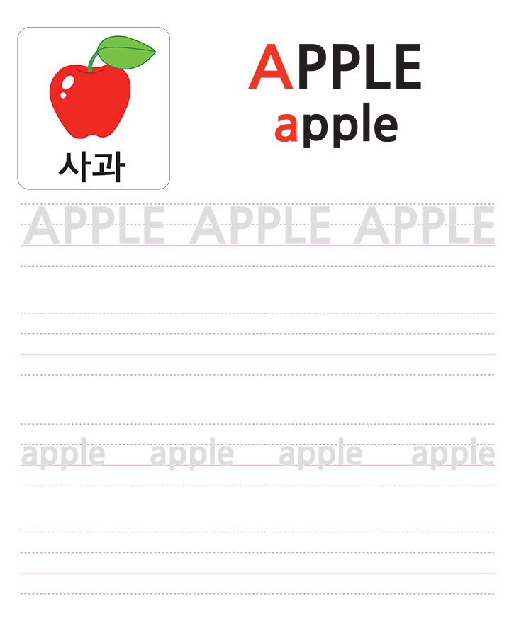 영어 알파벳 (A)으로 시작하는 기본 단어 쓰기. APPLE (사과)을 읽고 반복하십시오. 주제에 대해 이야기하십시오. 교사와 부모는 자녀가 잘할 수 있도록 격려하고 돕습니다.