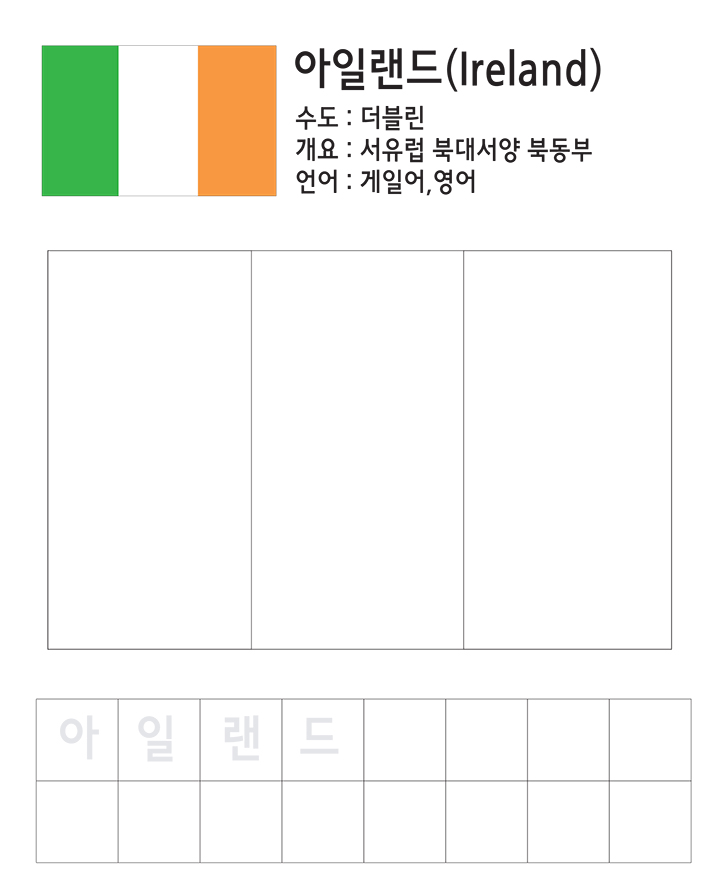 아일랜드를 한글로 써보고 국기를 예쁘게 색칠해보세요. 그리고 완성된 학습지를 보고 친구들과 함께 그 나라에 대해 이야기를 나눕니다. 선생님과 학부모님은 아이들에게 규칙을 설명해 주시고, 지도해 주세요. 자녀가 잘 할 수 있도록 격려하고 돕습니다. 친구들과 즐겁게 활용하세요.