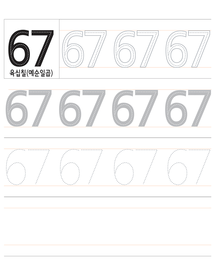 숫자 67을 읽고 따라 쓰세요. 숫자 67에 대해서 이해하고 연습합니다.
