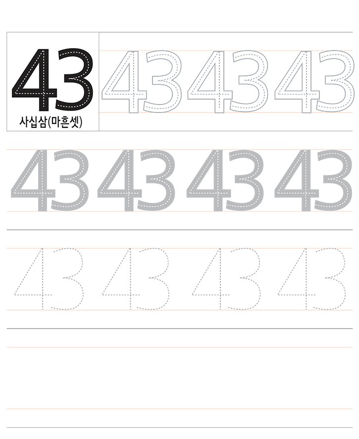 숫자 43을 읽고 따라 쓰세요. 숫자 43에 대해서 이해하고 연습합니다.