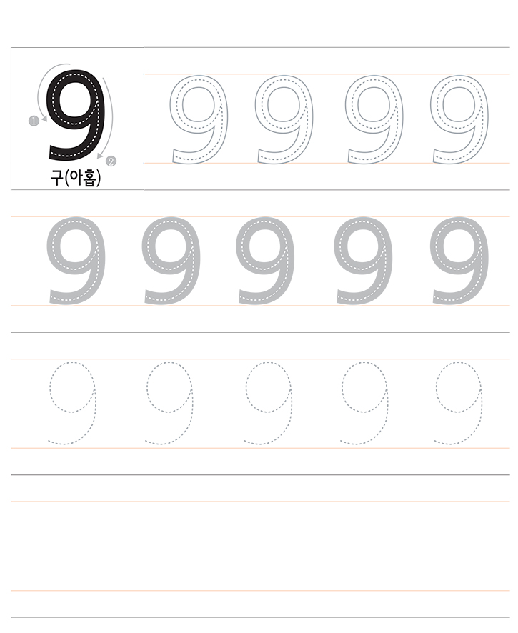 숫자 9을 읽고 따라 쓰세요. 숫자 9에대해서 이해하고 연습합니다.