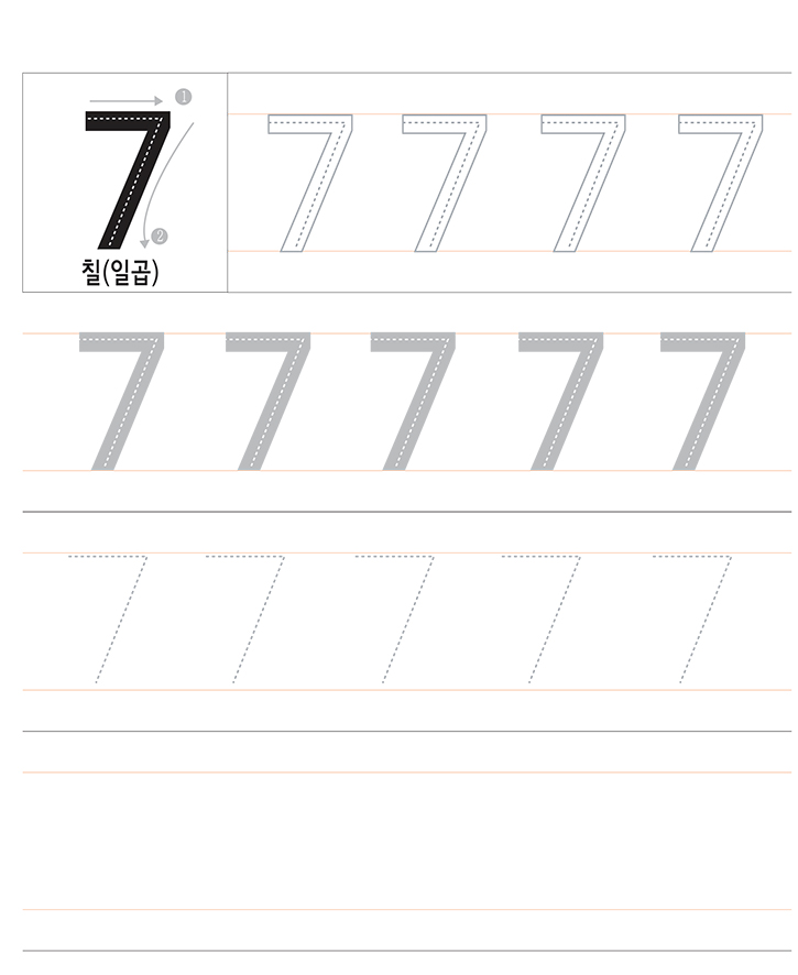 숫자 7을 읽고 따라 쓰세요. 숫자 7에대해서 이해하고 연습합니다.