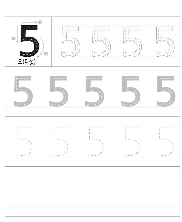 숫자 5을 읽고 따라 쓰세요. 숫자 5에대해서 이해하고 연습합니다.