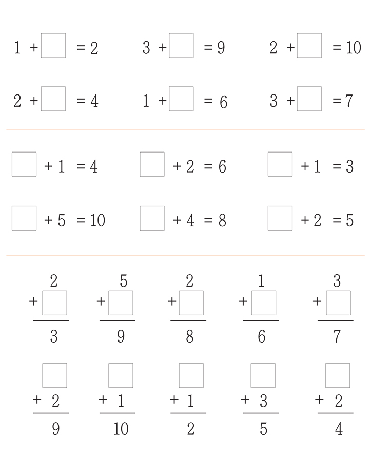 아래의 숫자 더하기를 계산하고 빈칸에 적절한 숫자를 완성하십시오. 반복 학습을 통해 덧셈을 이해합니다. 교사와 부모는 자녀가 잘할 수 있도록 격려하고 돕습니다.