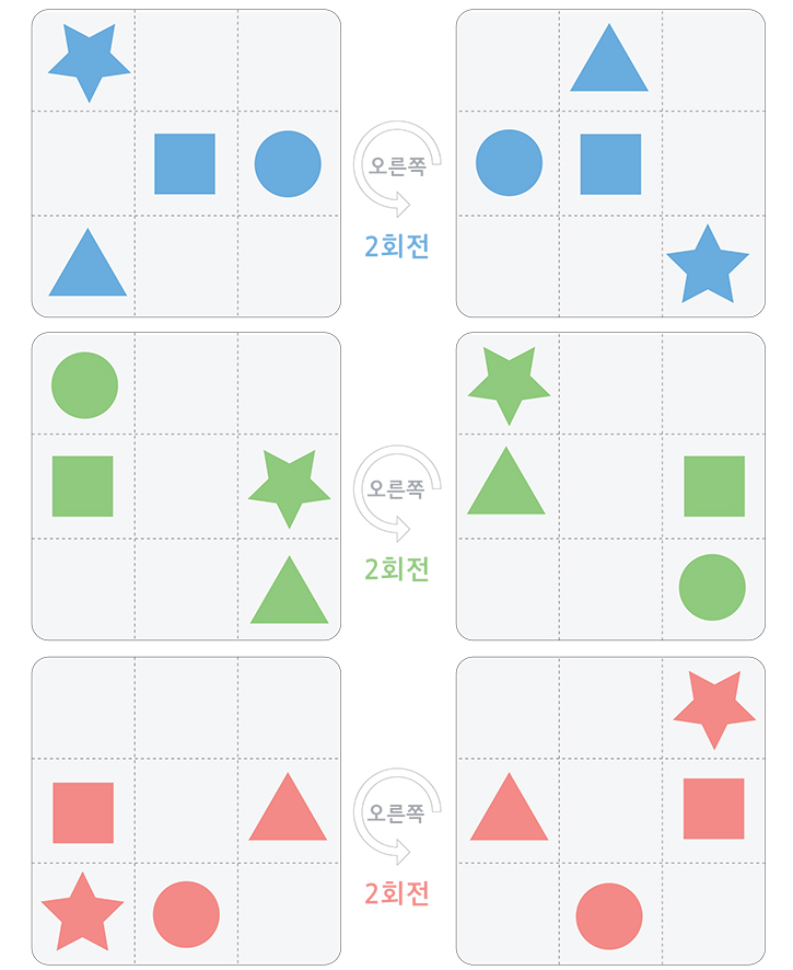 이 학습지는 현재의 도형 위치와 회전했을때의 도형 위치를 중 다른부분을 찾아 표기하는 게임입니다. 이 게임은 추리,유추,비교와 같은 기억력과 사고력을 향상시켜 주는 게임입니다. 친구들과 함께 재미있게 풀어보세요. 학부모님과 선생님은 아이들이 깊이 생각하고 사고할 수 있도록 유도해주세요.