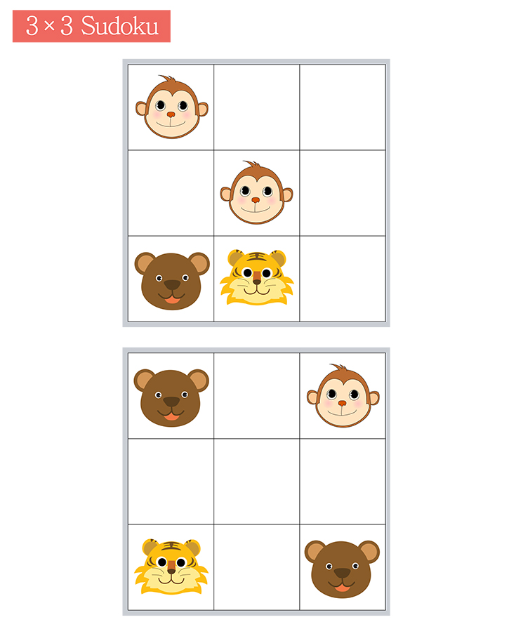 본 학습지는 3×3 (동물) 스도쿠 게임입니다. 아래 예문을 보고 가로/세로로 도형(호랑이,곰,원숭이)가 중복되지 않게 해주세요. 스도쿠는 사고력,기억력, 문제해결력을 키울 수 있습니다. 선생님과 학부모님은 아이들에게 규칙을 설명해주세요. 또한 단계별로 난의도를 올려주세요. 혼자서 쉽게 재미있게 문제를 풀어볼수 있는 퀴즈입니다. 그럼 재미있게 풀어보세요.