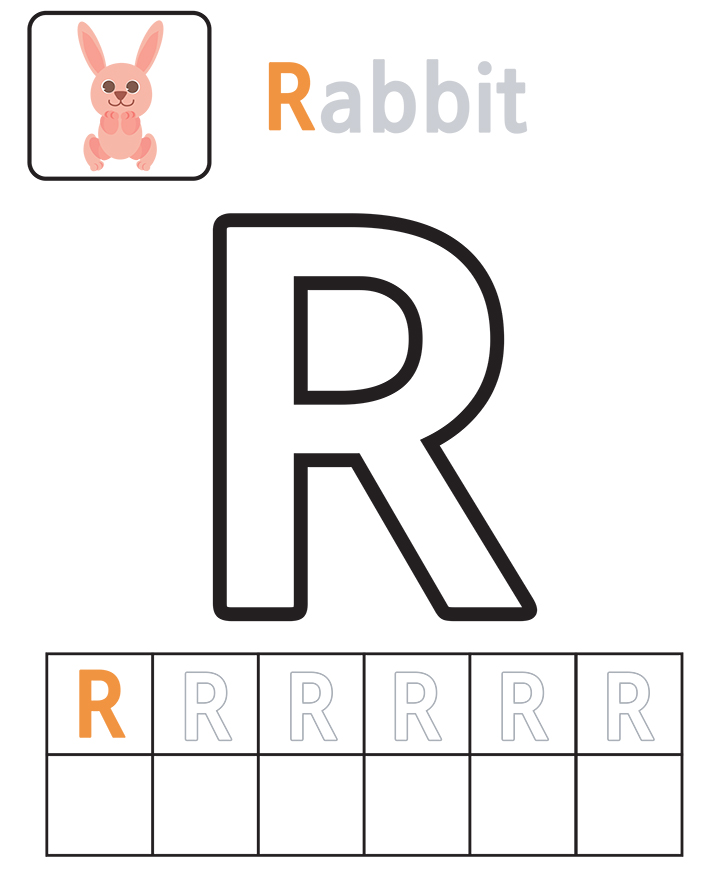 영어 알파벳 (R)색칠하기 입니다. 토끼(Rabbit)를 따라 읽고 아래 알파벳을 쓰고 색칠해보세요.