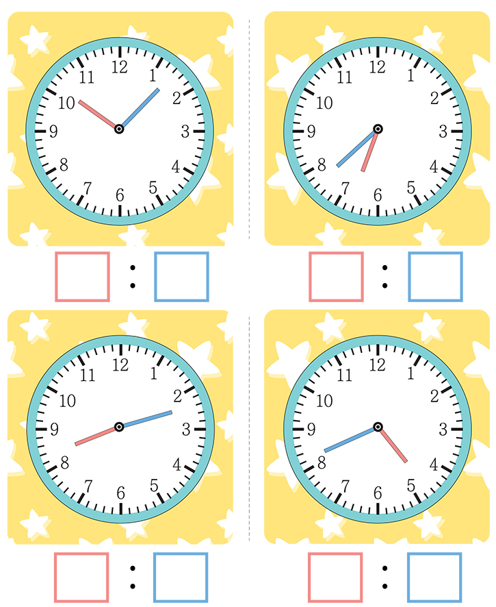 아래에 시계가 있습니다. 시계 지침을 보고 빈칸에 시간을 적어보세요. 시계 바늘이 가르키는 지침이 몇시인지 맞추는것이 목표입니다. 선생님이나 부모님은 시계 지침 보는법을 아이들에게 지도해 주세요. 시간을 이해하고 개념을 잡아가는데 도움이 될것입니다. 아마 놀랄만한 효과가 나타날것입니다.