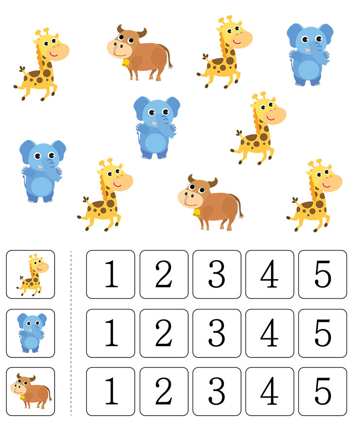 그림(기린,황소,코끼리)에 나와있는 수를 세어보세요. 그리고 알맞은 숫자에 색칠하는 것이 목표입니다. 재미있게 풀어보세요.