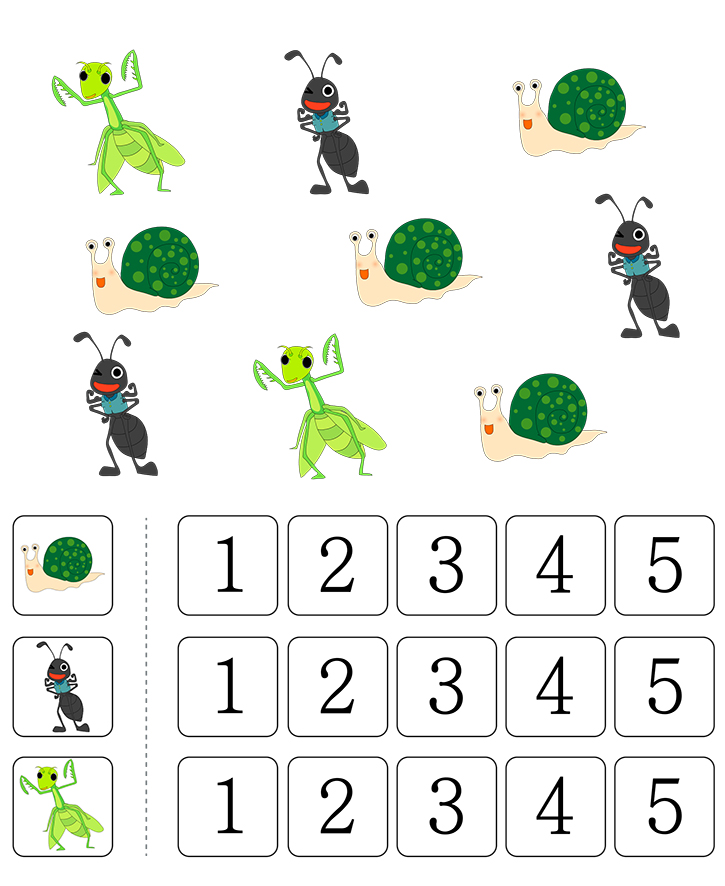 그림(달팽이,개미,사마귀)에 나와있는 수를 세어보세요. 그리고 알맞은 숫자에 색칠하는 것이 목표입니다. 재미있게 풀어보세요.
