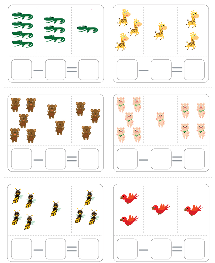 아래 그림(악어,기린,곰,돼지,벌,새)에 나와있는 수를 세어보고 빈칸에 알맞은 숫자를 넣어보세요. 그리고 연결된 숫자를 뺄셈하여 수식을 완성하는 것이 목표입니다. 다양한 방법과 반복적인 학습으로 공식을 이해하세요. 자연스럽게 공식을 만들어 가면서 학습을 마스터 합니다.