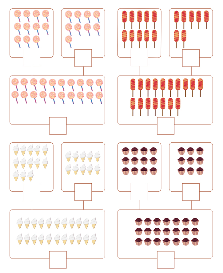 아래 그림(막대사탕,핫바,아이스크림,컵빵)에 나와있는 수를 세어보고 빈칸에 알맞은 숫자를 넣어보세요. 그리고 연결된 숫자를 덧셈하여 수식을 완성하는 것이 목표입니다. 다양한 방법과 반복적인 학습으로 공식을 이해하세요. 자연스럽게 공식을 만들어 가면서 학습을 마스터 합니다.