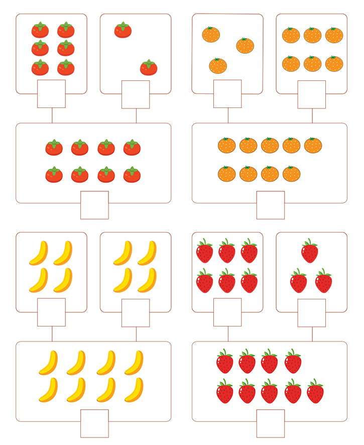 아래 그림(토마토,오렌지,바나나,딸기)에 나와있는 수를 세어보고 빈칸에 알맞은 숫자를 넣어보세요. 그리고 연결된 숫자를 덧셈하여 수식을 완성하는 것이 목표입니다. 다양한 방법과 반복적인 학습으로 공식을 이해하세요. 자연스럽게 공식을 만들어 가면서 학습을 마스터 합니다.