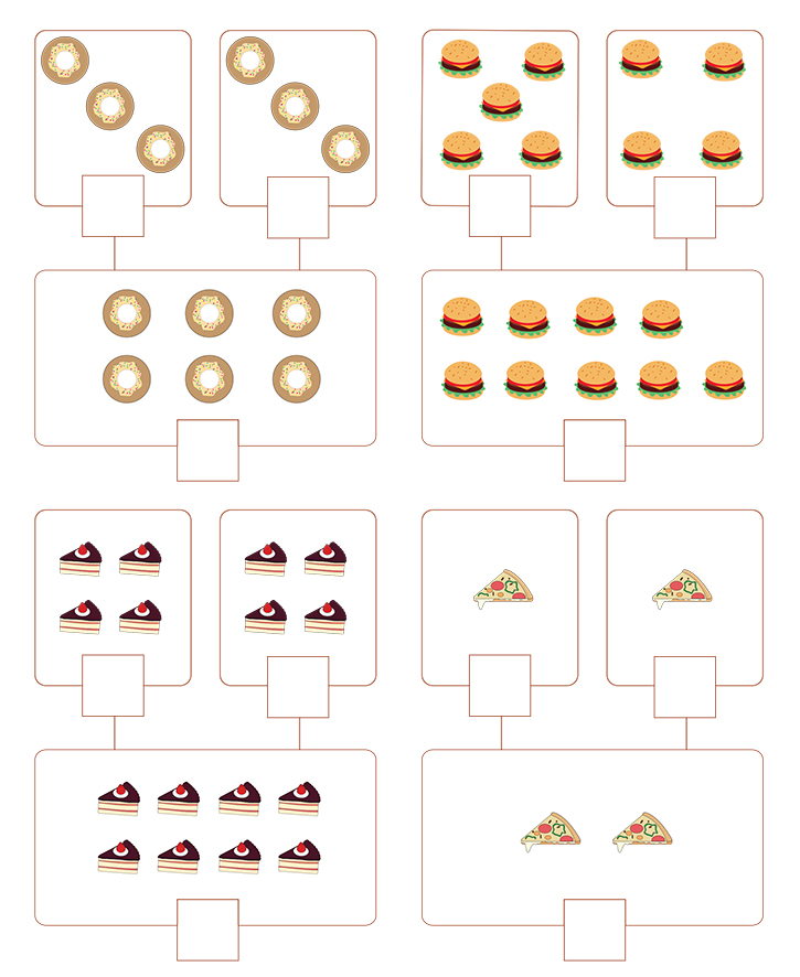 아래 그림(도넛,햄버거,케익,피자)에 나와있는 수를 세어보고 빈칸에 알맞은 숫자를 넣어보세요. 그리고 연결된 숫자를 덧셈하여 수식을 완성하는 것이 목표입니다. 다양한 방법과 반복적인 학습으로 공식을 이해하세요. 자연스럽게 공식을 만들어 가면서 학습을 마스터 합니다.