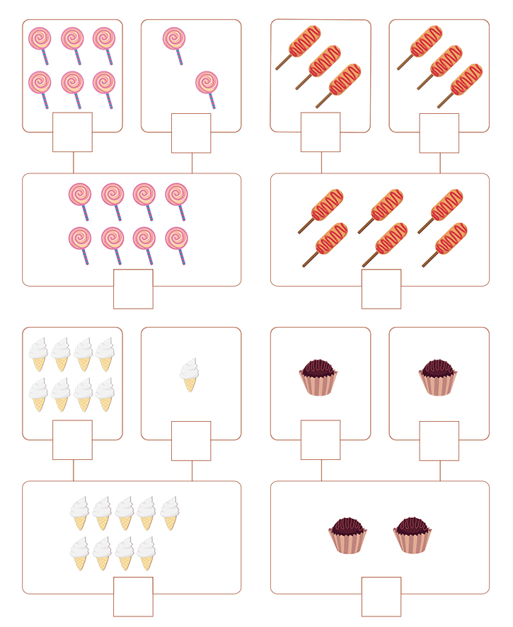 아래 그림(막대사탕,핫바,아이스크림,컵케익)에 나와있는 수를 세어보고 빈칸에 알맞은 숫자를 넣어보세요. 그리고 연결된 숫자를 덧셈하여 수식을 완성하는 것이 목표입니다. 다양한 방법과 반복적인 학습으로 공식을 이해하세요. 자연스럽게 공식을 만들어 가면서 학습을 마스터 합니다.