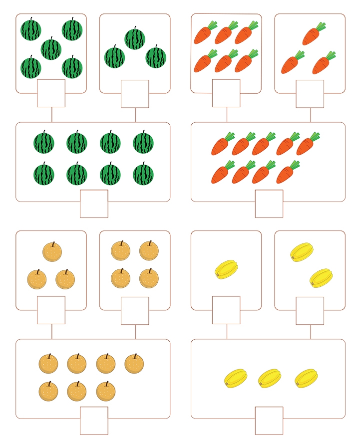 아래 그림(수박,당근,오렌지,참외)에 나와있는 수를 세어보고 빈칸에 알맞은 숫자를 넣어보세요. 그리고 연결된 숫자를 덧셈하여 수식을 완성하는 것이 목표입니다. 다양한 방법과 반복적인 학습으로 공식을 이해하세요. 자연스럽게 공식을 만들어 가면서 학습을 마스터 합니다.