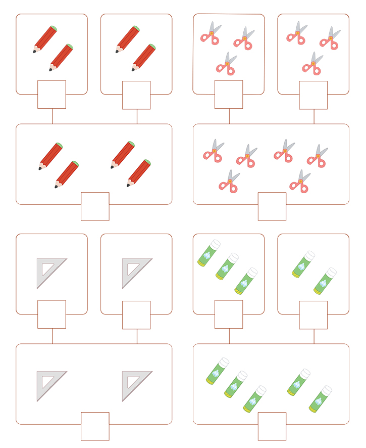 아래 그림(연필,가위,삼각자,풀)에 나와있는 수를 세어보고 빈칸에 알맞은 숫자를 넣어보세요. 그리고 연결된 숫자를 덧셈하여 수식을 완성하는 것이 목표입니다. 다양한 방법과 반복적인 학습으로 공식을 이해하세요. 자연스럽게 공식을 만들어 가면서 학습을 마스터 합니다.