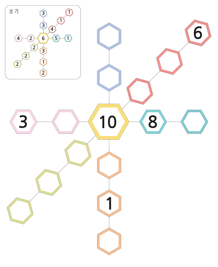 아래 보기에 있는 육각형의 숫자를 확인하고 빈 칸에 들어갈 알맞은 숫자를 적으세요.