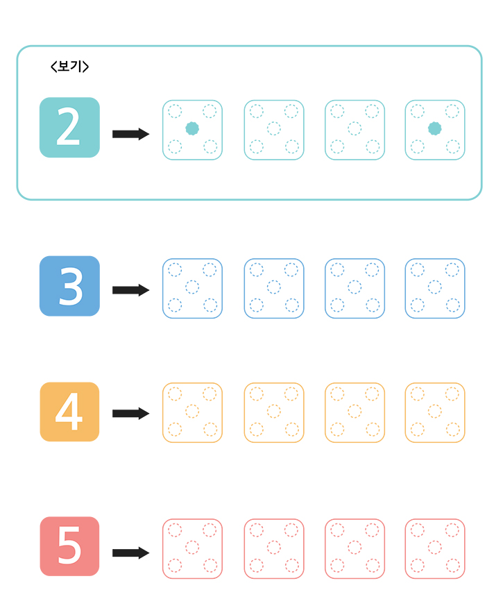 아래 보기를 보고 숫자와 동일하게 주사위를 완성해 보세요.