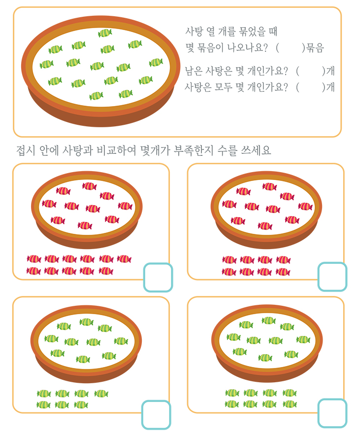 아래 그림(사탕)에 나와있는 수를 세어보고 지문에 맞는 답을 찾으세요. (묶음수,나머지,합계) 등을 표시하는 것이 목표입니다. 다양한 방법을 찾아보고 반복적인 학습으로 공식을 이해하세요. 공식을 만들어 가면서 학습을 마스터 합니다. 그림(햄버거,컵케익,조각케익,핫바)에 나와있는 수를 세어보세요. 그리고 알맞은 숫자에 표시하는 것이 목표입니다. 재미있게 풀어보세요. 아래 그림(블럭)에 나와있는 수를 세어보고 빈칸에 알맞은 숫자를 넣어보세요. 그리고 연결된 숫자를 덧셈하여 수식을 완성하는 것이 목표입니다. 다양한 방법과 반복적인 학습으로 공식을 이해하세요. 자연스럽게 공식을 만들어 가면서 학습을 마스터 합니다.