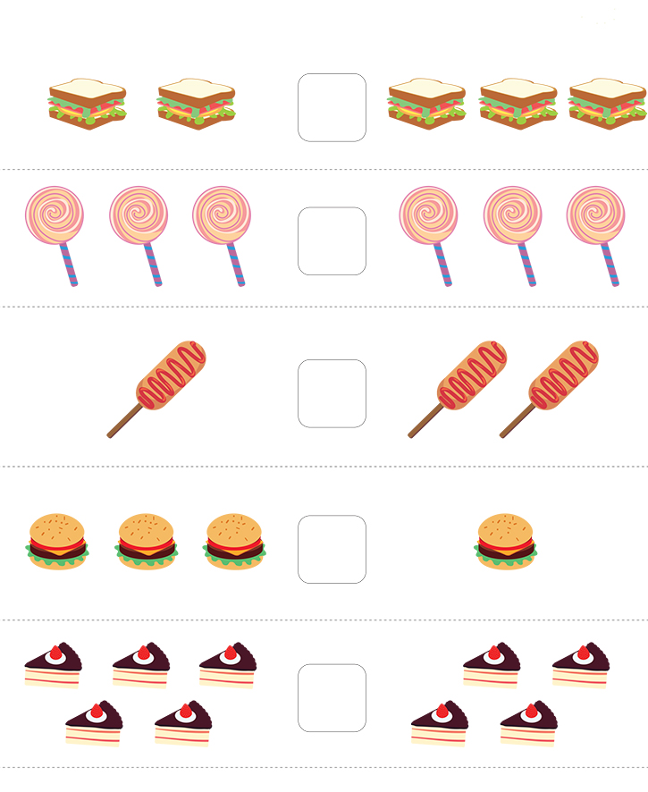 아래 그림(샌드위치,막대사탕,핫바,햄버거,케익)이 있습니다. 각 그림마다 수를 세어보고 많은쪽에 등호를 < = > 를 넣어보세요. 크기를 비교하여 큰것과 작은것 동일한것을 서로 이해하는 것이 목표입니다. 다양한 방법으로 비교하며 학습해 보세요.