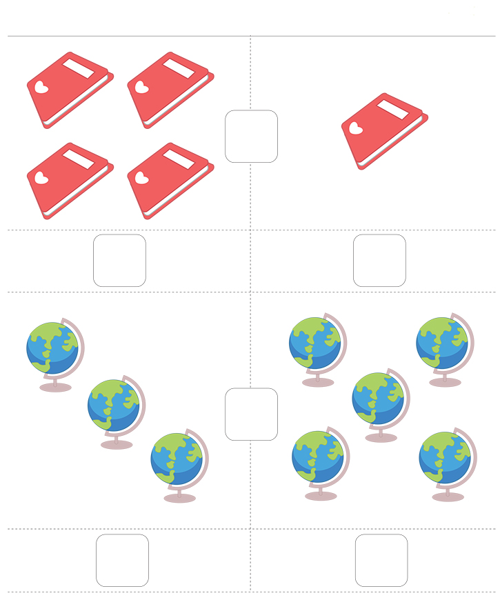 아래 그림(노트,지구본)이 있습니다. 각 그림마다 수를 세어보고 많은쪽에 등호를 < = > 를 넣어보세요. 크기를 비교하여 큰것과 작은것 동일한것을 서로 이해하는 것이 목표입니다. 다양한 방법으로 비교하며 학습해 보세요.