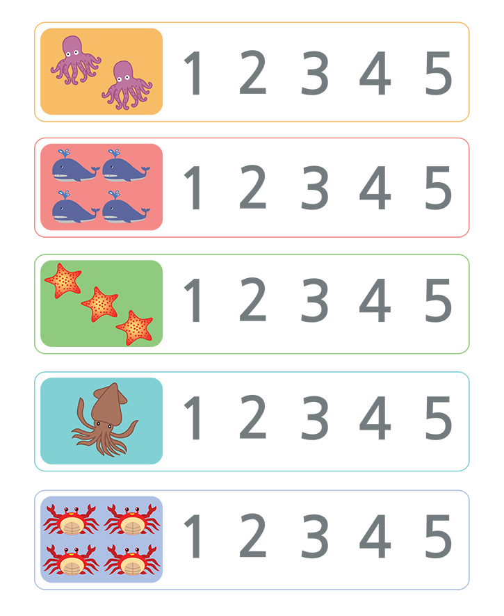 그림(동물,고래,불가사리,오징어,대게)에 나와있는 수를 세어보세요. 그리고 알맞은 숫자에 표시하는 것이 목표입니다. 재미있게 풀어보세요.