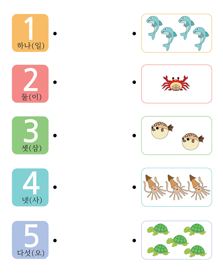 아래 동물(돌고래,대게,복어,오징어,거북이)의 수를 세어보세요. 그리고 똑같은 수를 찾아 같은 개수끼리 줄을 연결하는 것이 목표입니다.