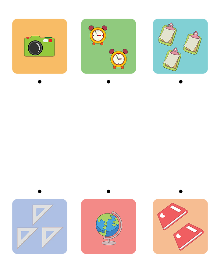 아래 그림(카메라,시계,알림장,삼각자,지구본,노트)의 수를 세어보세요. 그리고 똑같은 수의 사물을 찾아 같은 개수끼리 줄을 연결하는 것이 목표입니다.