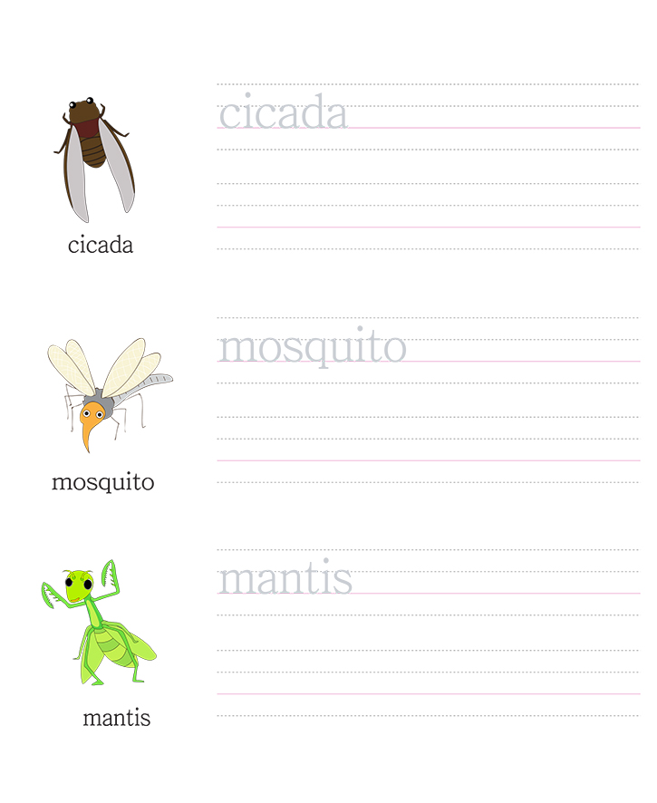 주제별 영어 단어 읽기 및 쓰기. 영어로 읽고 쓰기 (매미, 모기, 사마귀). 기본 영어 단어를 자연스럽게 배울 수 있습니다. 교사와 부모는 아이들이 배울 수 있도록 격려를 요청합니다.