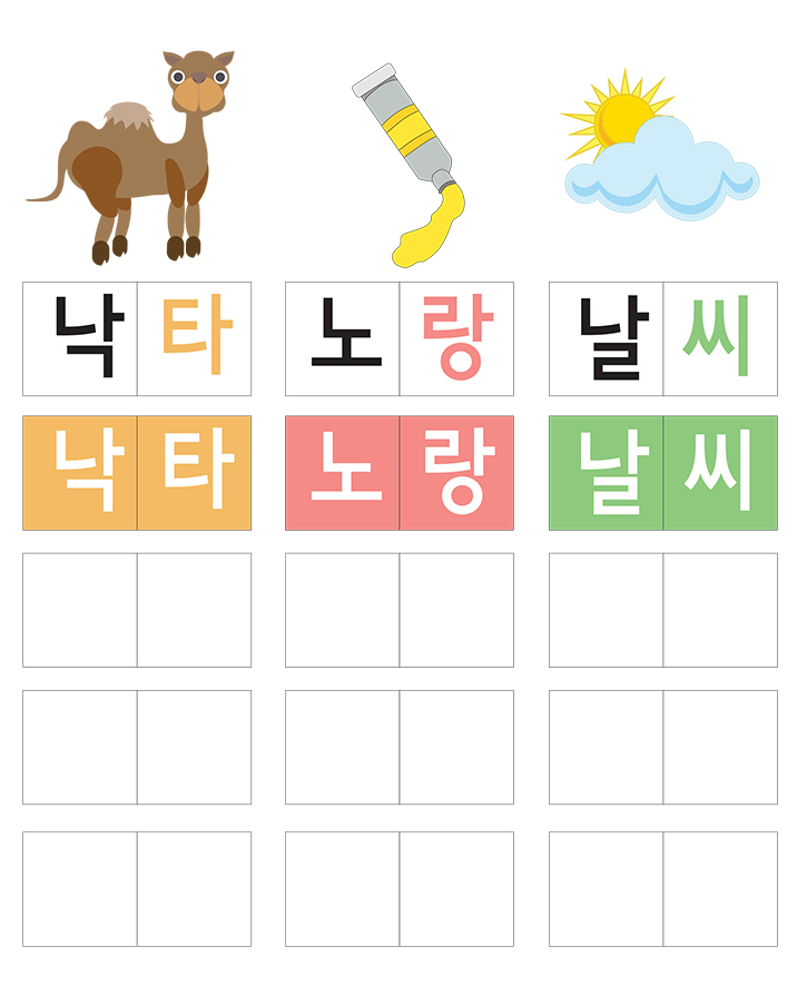 📄 한글 단어 (ㄴ)이 들어가는 낱말쓰기 (낙타,노랑,날씨)