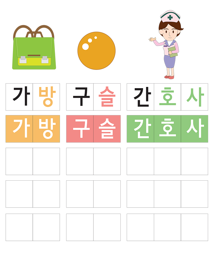 한글 낱말 중 (가방,구슬,간호사)을 읽고 따라 써보세요.
