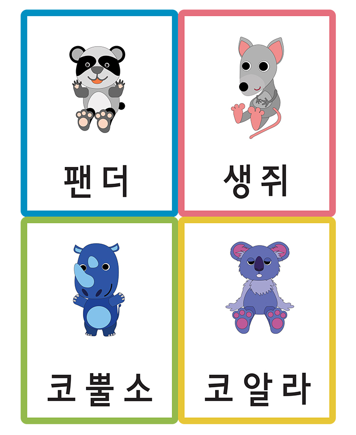 동물/포유류와 관련된 (팬더,생쥐,코뿔소,코알라)을 표현한 낱말 그림카드입니다. 이 카드를 활용하여 가정이나 학교, 유치원,어린이집에서 유아기에 필요한 한글 통글자 익히기, 사물인지, 부교재 등 다양한 영역에서 활용이 가능합니다. 도서나 교재와 함께 활용하면 아주 훌륭한 자료가 될 것 입니다. 아래 카드를 출력후 가위로 잘라서 코팅지나 양면테이프, 벨크로 등을 붙여서 활용 할 수 있습니다. 현재 활용하고 있는 자료를 다른 분들을 위하여 공유해 주신다면 회원분들께 많은 도움이 될 것입니다.
