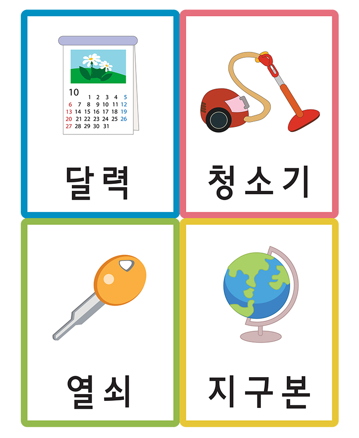 생활/사무와 관련된 (달력,청소기,열쇠,지구본)을 표현한 낱말 그림카드입니다. 이 카드를 활용하여 가정이나 학교, 유치원,어린이집에서 유아기에 필요한 한글 통글자 익히기, 사물인지, 부교재 등 다양한 영역에서 활용이 가능합니다. 도서나 교재와 함께 활용하면 아주 훌륭한 자료가 될 것 입니다. 아래 카드를 출력후 가위로 잘라서 코팅지나 양면테이프, 벨크로 등을 붙여서 활용 할 수 있습니다. 현재 활용하고 있는 자료를 다른 분들을 위하여 공유해 주신다면 회원분들께 많은 도움이 될 것입니다.