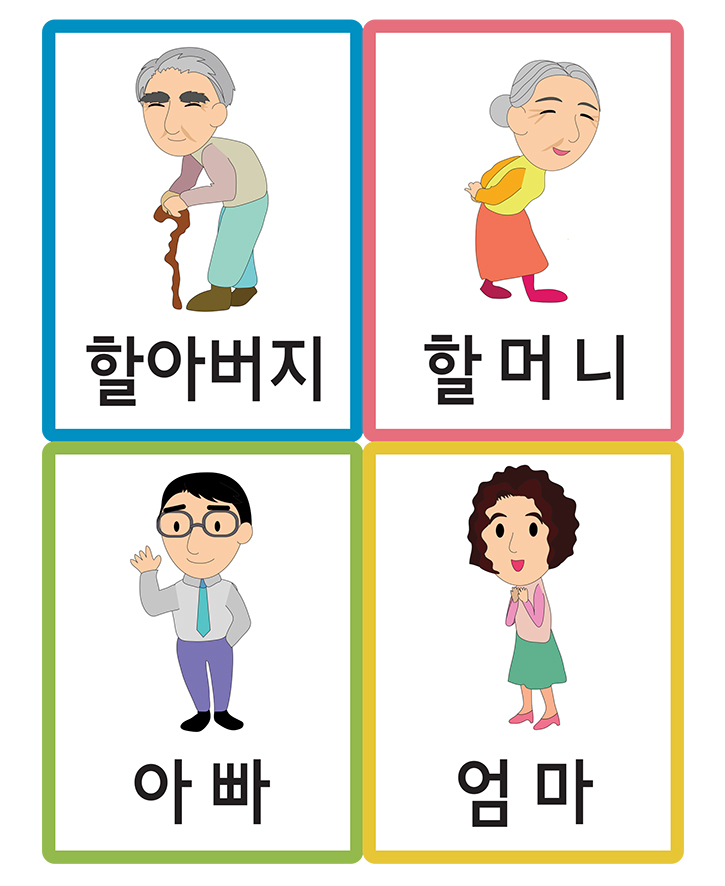 가족/직업/신체와 관련된 (할아버지,할머니,아빠,엄마)을 표현한 낱말 그림카드입니다. 이 카드를 활용하여 가정이나 학교, 유치원,어린이집에서 유아기에 필요한 한글 통글자 익히기, 사물인지, 부교재 등 다양한 영역에서 활용이 가능합니다. 도서나 교재와 함께 활용하면 아주 훌륭한 자료가 될 것 입니다. 아래 카드를 출력후 가위로 잘라서 코팅지나 양면테이프, 벨크로 등을 붙여서 활용 할 수 있습니다. 현재 활용하고 있는 자료를 다른 분들을 위하여 공유해 주신다면 회원분들께 많은 도움이 될 것입니다.