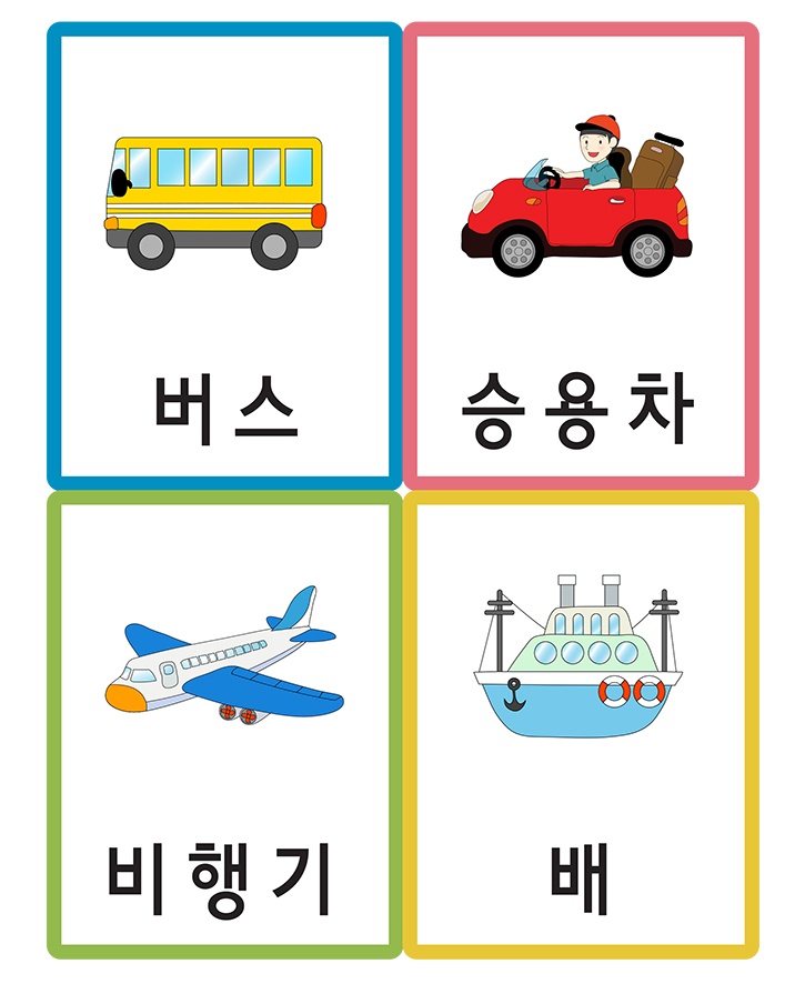 교통수단과 관련된 (버스,승용차,비행기,배)을 표현한 낱말 그림카드입니다. 이 카드를 활용하여 가정이나 학교, 유치원,어린이집에서 유아기에 필요한 한글 통글자 익히기, 사물인지, 부교재 등 다양한 영역에서 활용이 가능합니다. 도서나 교재와 함께 활용하면 아주 훌륭한 자료가 될 것 입니다. 아래 카드를 출력후 가위로 잘라서 코팅지나 양면테이프, 벨크로 등을 붙여서 활용 할 수 있습니다. 현재 활용하고 있는 자료를 다른 분들을 위하여 공유해 주신다면 회원분들께 많은 도움이 될 것입니다.