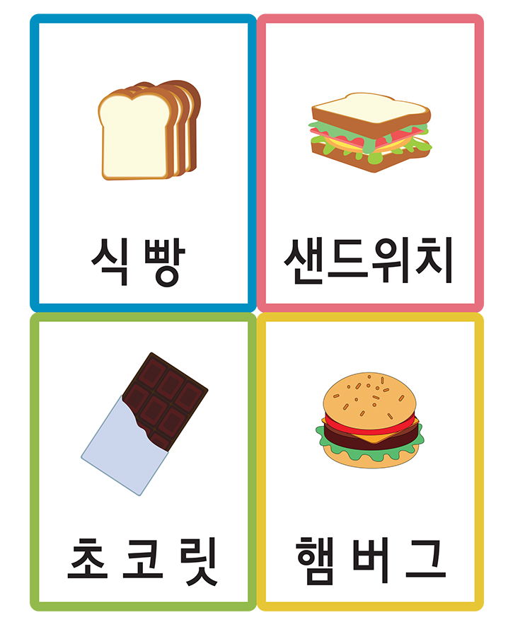 음식/요리와 관련된 (식빵,샌드위치,초코릿,햄버거)을 표현한 낱말 그림카드입니다. 이 카드를 활용하여 가정이나 학교, 유치원,어린이집에서 유아기에 필요한 한글 통글자 익히기, 사물인지, 부교재 등 다양한 영역에서 활용이 가능합니다. 도서나 교재와 함께 활용하면 아주 훌륭한 자료가 될 것 입니다. 아래 카드를 출력후 가위로 잘라서 코팅지나 양면테이프, 벨크로 등을 붙여서 활용 할 수 있습니다. 현재 활용하고 있는 자료를 다른 분들을 위하여 공유해 주신다면 회원분들께 많은 도움이 될 것입니다.