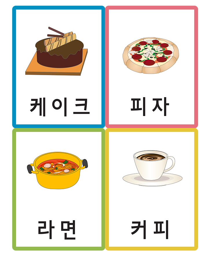 음식/요리와 관련된 (케이크,피자,라면,커피)을 표현한 낱말 그림카드입니다. 이 카드를 활용하여 가정이나 학교, 유치원,어린이집에서 유아기에 필요한 한글 통글자 익히기, 사물인지, 부교재 등 다양한 영역에서 활용이 가능합니다. 도서나 교재와 함께 활용하면 아주 훌륭한 자료가 될 것 입니다. 아래 카드를 출력후 가위로 잘라서 코팅지나 양면테이프, 벨크로 등을 붙여서 활용 할 수 있습니다. 현재 활용하고 있는 자료를 다른 분들을 위하여 공유해 주신다면 회원분들께 많은 도움이 될 것입니다.