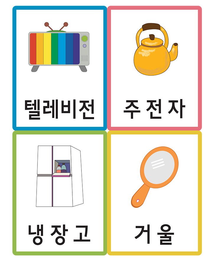 생활/사무와 관련된 (텔레비젼,주전자,냉장고,거울)을 표현한 낱말 그림카드입니다. 이 카드를 활용하여 가정이나 학교, 유치원,어린이집에서 유아기에 필요한 한글 통글자 익히기, 사물인지, 부교재 등 다양한 영역에서 활용이 가능합니다. 도서나 교재와 함께 활용하면 아주 훌륭한 자료가 될 것 입니다. 아래 카드를 출력후 가위로 잘라서 코팅지나 양면테이프, 벨크로 등을 붙여서 활용 할 수 있습니다. 현재 활용하고 있는 자료를 다른 분들을 위하여 공유해 주신다면 회원분들께 많은 도움이 될 것입니다.