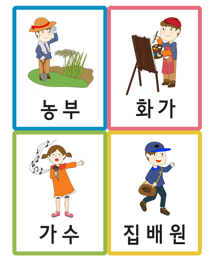 가족/직업/신체와 관련된 (농부,화가,가수,집배원)을 표현한 낱말 그림카드입니다. 이 카드를 활용하여 가정이나 학교, 유치원,어린이집에서 유아기에 필요한 한글 통글자 익히기, 사물인지, 부교재 등 다양한 영역에서 활용이 가능합니다. 도서나 교재와 함께 활용하면 아주 훌륭한 자료가 될 것 입니다. 아래 카드를 출력후 가위로 잘라서 코팅지나 양면테이프, 벨크로 등을 붙여서 활용 할 수 있습니다. 현재 활용하고 있는 자료를 다른 분들을 위하여 공유해 주신다면 회원분들께 많은 도움이 될 것입니다.