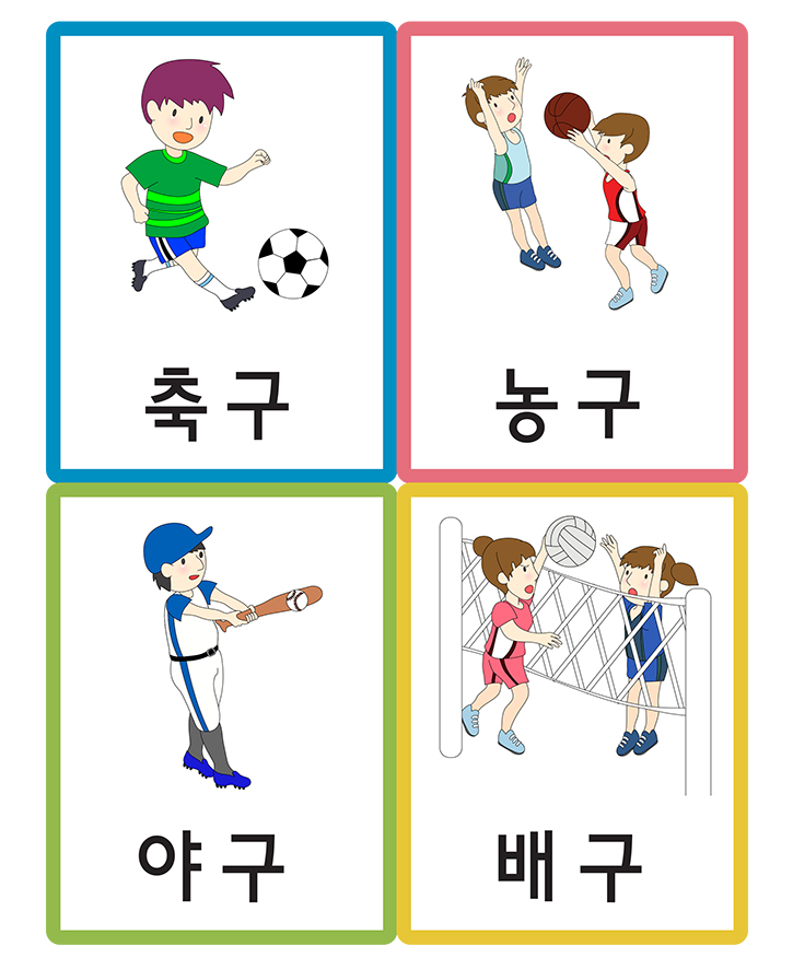 가족/직업/신체/스포츠와 관련된 (축구,농구,야구,배구)을 표현한 낱말 그림카드입니다. 이 카드를 활용하여 가정이나 학교, 유치원,어린이집에서 필요한 한글 통글자 익히기, 사물인지, 부교재 등 다양한 영역에서 활용이 가능합니다. 도서나 교재와 함께 활용하면 아주 훌륭한 자료가 될 것 입니다. 아래 카드를 출력후 가위로 잘라서 코팅지나 양면테이프, 벨크로 등을 붙여서 활용 할 수 있습니다. 현재 활용하고 있는 자료를 다른 분들을 위하여 공유해 주신다면 회원분들께 많은 도움이 될 것입니다.