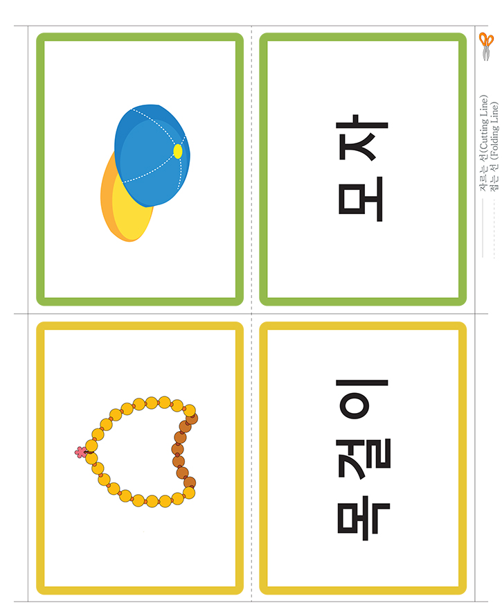 의류(모자,목걸이)을 표현한 낱말 그림카드입니다. 가정이나 학교, 유치원,어린이집에서 유아기에 필요한 한글통글자 익히기, 사물인지, 부교재 등 다양한 영역에서 카드 활용이 가능합니다. 도서나 교재와 함께 활용하세요. 아주 훌륭한 자료가 될 것 입니다. 아래 카드를 출력후 가위로 잘라서 코팅지나 양면테이프, 벨크로 등을 붙여서 활용 할 수 있습니다. 다양한 카드 사용법을 공유하여 주세요. 많은 도움이 될것입니다.
